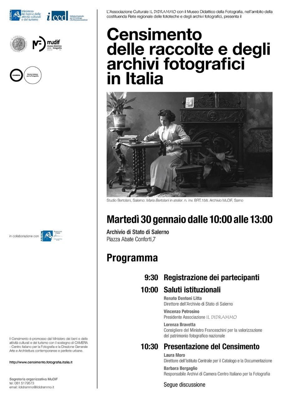 Il 30 gennaio, dalle ore 9.30 alle 13.00, presso l’Archivio di Stato di Salerno, si svolgerà l’incontro di presentazione del Censimento Nazionale dei Beni Fotografici.