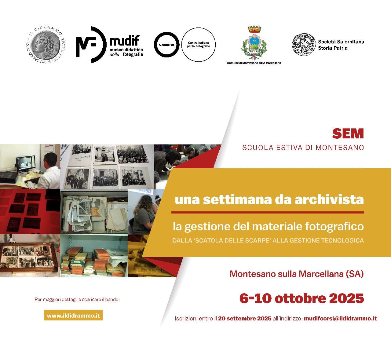 Dal 6 al 10 ottobre 2025 si svolgerà a Montesano sulla Marcellana la scuola formativa “Una settimana da archivista. La gestione del materiale fotografico: dalla ‘scatola delle scarpe’ alla gestione tecnologica”, promossa dall’Associazione IL DIDRAMMO APS – Museo Didattico della Fotografia (MuDiF) in collaborazione con la Fondazione CAMERA – Centro Italiano per la Fotografia di Torino ETS.